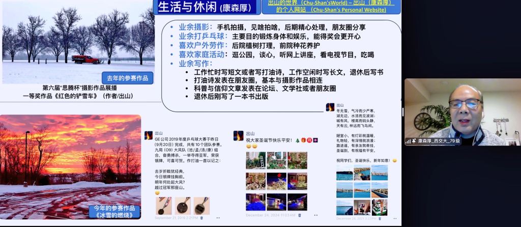 在主持人介绍了我的概况之后,接下来就轮到我分享自己的经历和生活感受。这包括三个方面:(1)。学习与工作,(2)。生活与休闲,(3)。退休之后。由于大会分享时间的限制,我用了三张slides图示化表达,尽量减少语言,并且将三张slides中的中间一张“生活与休闲“直接越过,以节省时间。然而,后来当我发现美洲交大校友总会会长不忍这张slide的内容被埋没,亲自截了图,发在了另外一个校友群里时,令我好生感动。这也成为了我在这次大会发言时的唯一一张带图像的截图,对我来说非常宝贵,一定会好好保存,在此也对美洲交大校友总会会长的截图深表感谢。