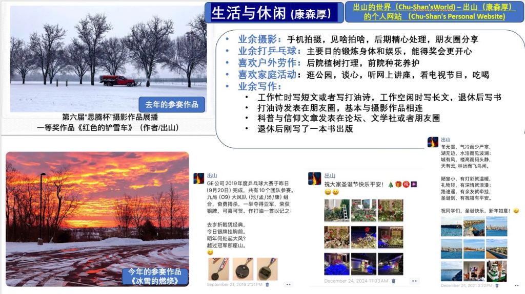 去年有一幅摄影作品,参加交大校友摄影作品展,获得了一等奖,作品名叫《红色的铲雪车》。今年有送去一幅摄影作品,名叫《冰雪的燃烧》。打乒乓球获得过GE公司2019年度团体赛亚军。在“生活与休闲”slide里,还有一些例子。这里不再多述及。